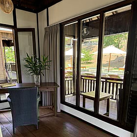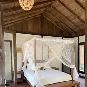Each villa also has its own ensuite bathroom with shower, queen size bed with mosquito net, a writing desk and chair, and balcony to sit outside and relax, offering luxury Tangkoko accommodation.